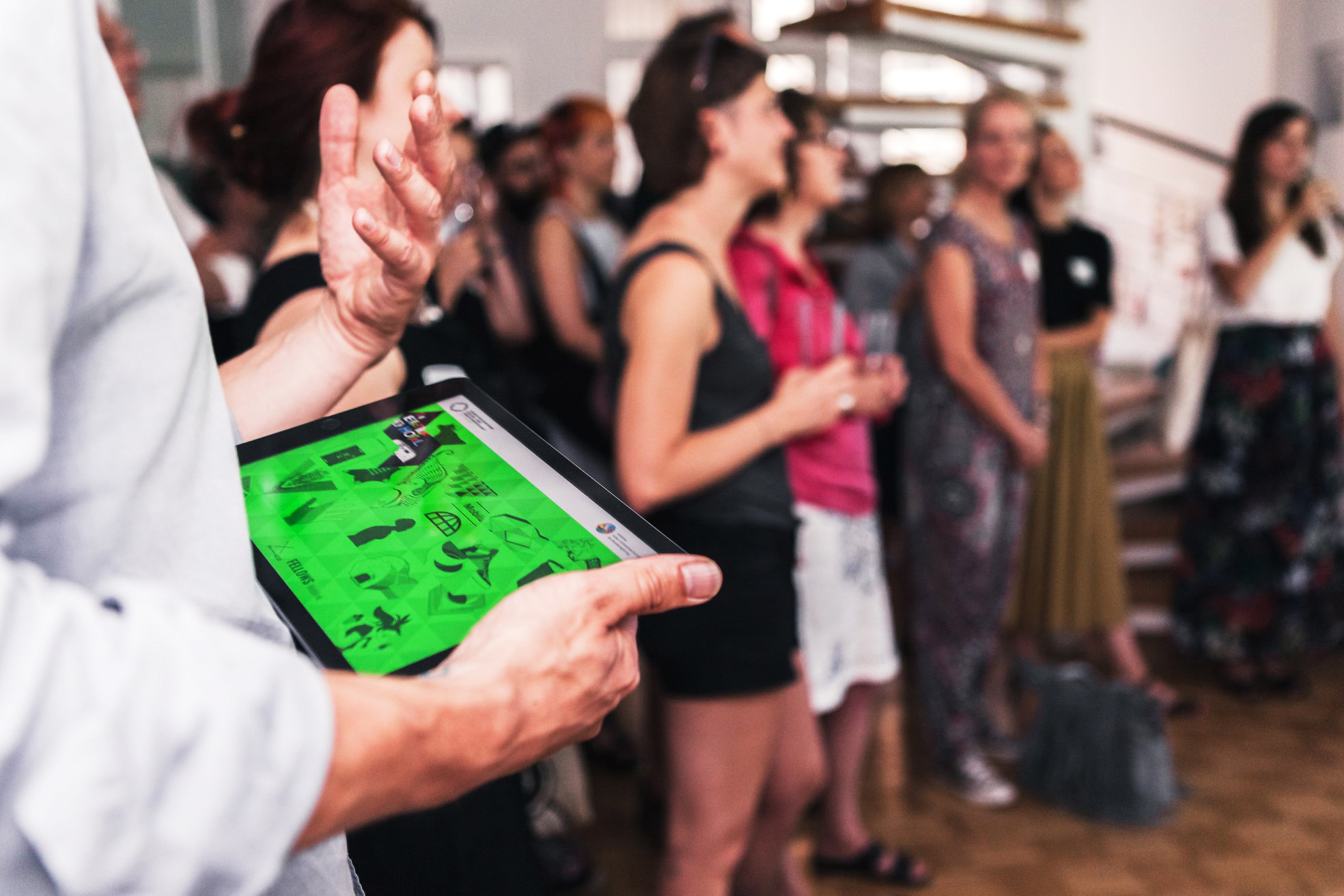 Das Layout der GUI basiert auf dem gleichen Dreiecksraster wie die Ausstellungswand. So kann man sofort jedes Projekt zu dem man mehr erfahren möchte in der App lokalisieren. Durch Auswahl eines Projekts wird ein kurzes erklärendes Video abgespielt und die Projektion der Animation und des Videos auf der Ausstellungswand wird ausgelöst.